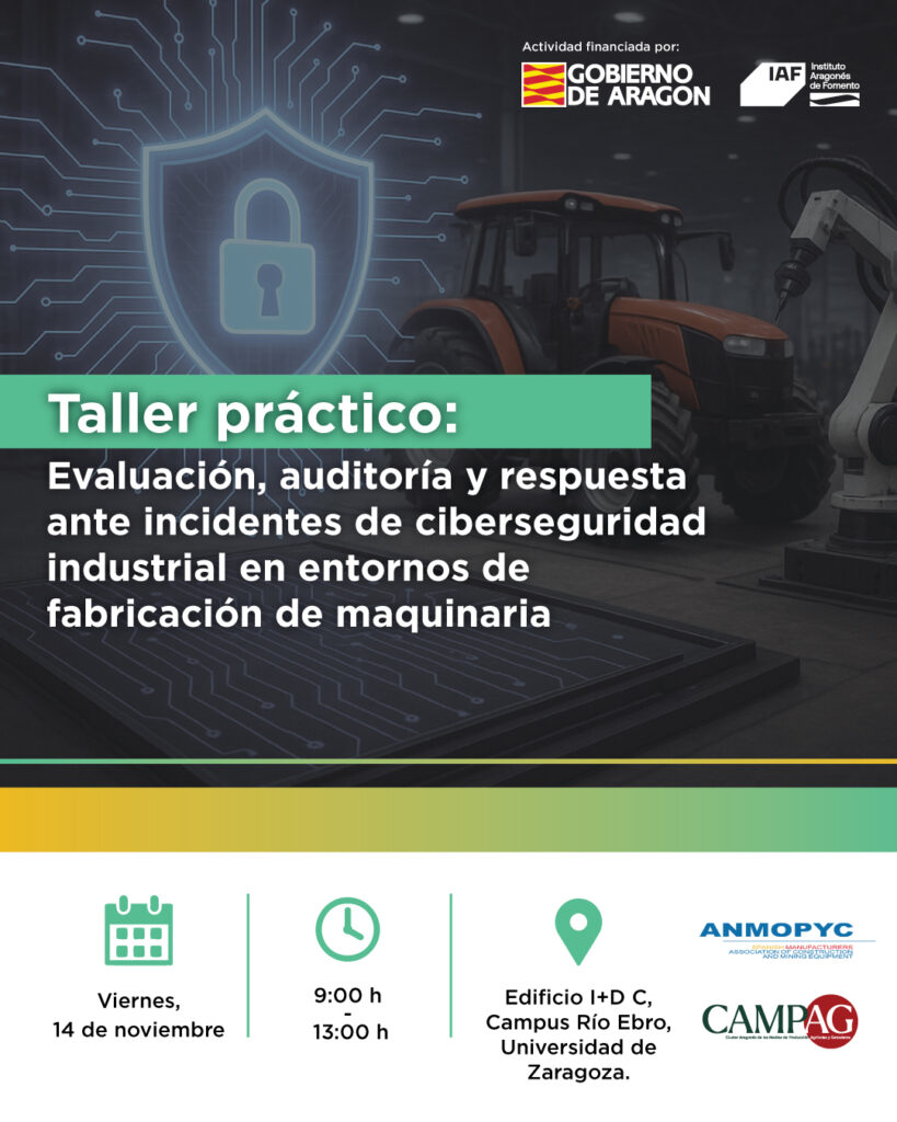 En el marco de SecurizAR, CAMPAG y ANMOPYC organizan una jornada práctica sobre ciberseguridad industrial, que tendrá lugar el viernes 14 de noviembre, de 9:00 h a 13:00 h, en el Edificio I+D C del Campus Río Ebro de la Universidad de Zaragoza