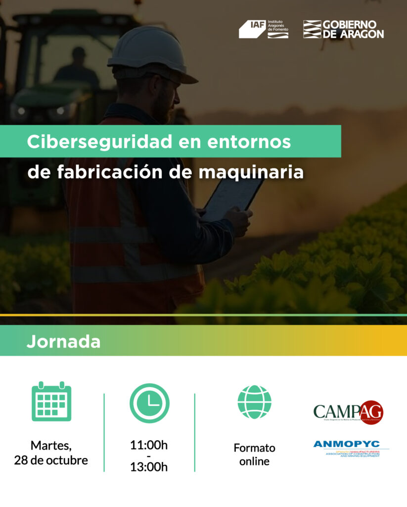 | Por este motivo, ANMOPYC y CAMPAG organizan la jornada presencial “Ciberseguridad en entornos de fabricación de maquinaria”, que se celebrará el 28 de octubre en Zaragoza. Una jornada completa donde podrás aprender, compartir y conectar con expertos y empresas que están liderando el cambio hacia un entorno industrial más seguro. La Jornada dará comienzo con la sesión técnica: Retos y estrategias en materia de ciberseguridad industrial Horario: 11:00 h a 13:00 h Formato Online Durante la mañana, expertos de empresas como Integra, Hiberus, ITA, TÜV y Monclús compartirán su experiencia en torno a los retos actuales de la ciberseguridad industrial, abordando temas como: – Protección de infraestructuras conectadas, – Gestión de riesgos y vulnerabilidades, – Casos reales y buenas prácticas aplicados a la fabricación de maquinaria, – Cumplimiento de normativas, – Papel de la inteligencia artificial en la detección y respuesta ante amenazas, – Ayudas disponibles para impulsar la ciberseguridad en el sector. Los ponentes serán: INTEGRA – Gonzalo Bernal, Director General de Tecnología HIBERUS – Eduardo Gistau, Global Head of Cybersecurity ITA – Rafael del Hoyo, Responsable de IA y Sistemas Cognitivos SMF Monclus – Álvaro Monclús, Abogado TÜV Rheinland “Actividad financiada por el IAF” |